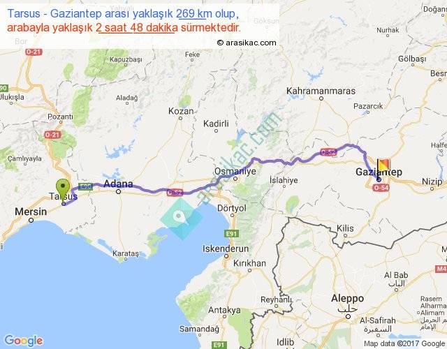 Tarsus - Gaziantep arası yaklaşık olarak 90 km/h ile yukarıda belirtilen sürede olup, iki yerin kuş uçuşu uzaklığı (mesafesi) 220'dir. Yolculuk otobüsle 3 saat 38 dakika sürmektedir.