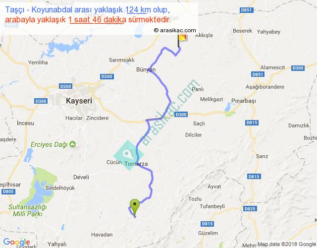 Taşçı - Koyunabdal arası yaklaşık olarak 90 km/h ile yukarıda belirtilen sürede olup, iki yerin kuş uçuşu uzaklığı (mesafesi) 84'dir. Yolculuk otobüsle 2 saat 17 dakika sürmektedir.