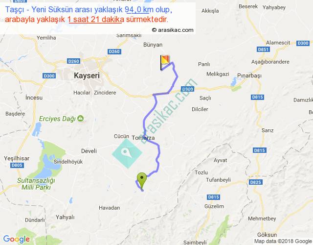 Taşçı - Yeni Süksün arası yaklaşık olarak 90 km/h ile yukarıda belirtilen sürede olup, iki yerin kuş uçuşu uzaklığı (mesafesi) 59'dir. Yolculuk otobüsle 1 saat 45 dakika sürmektedir.