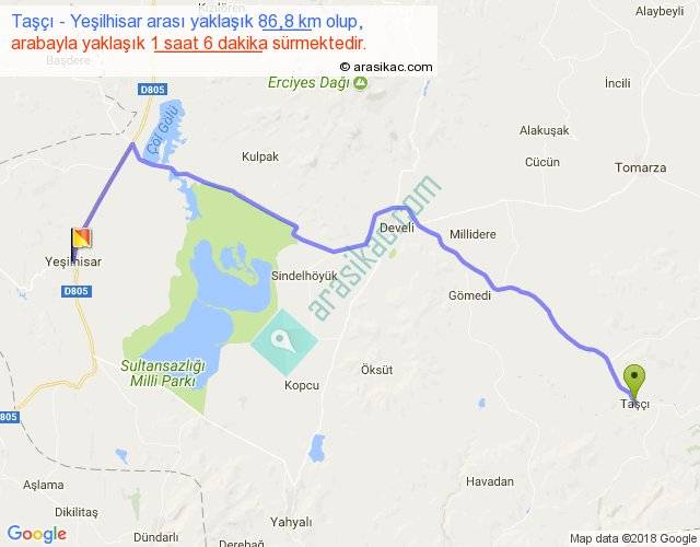 Taşçı - Yeşilhisar arası yaklaşık olarak 90 km/h ile yukarıda belirtilen sürede olup, iki yerin kuş uçuşu uzaklığı (mesafesi) 63'dir. Yolculuk otobüsle 1 saat 25 dakika sürmektedir.