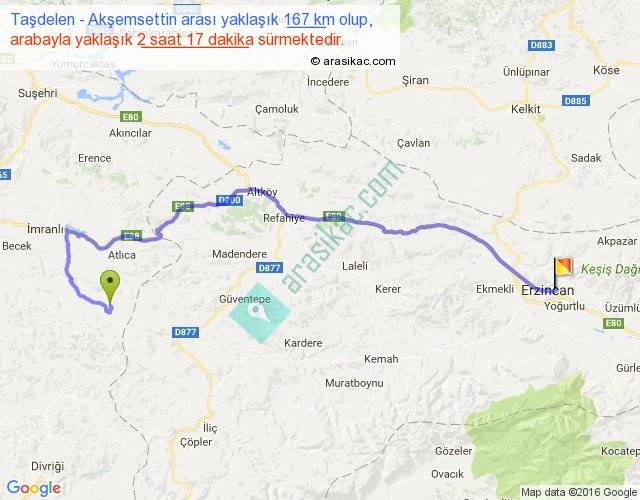 Taşdelen - Akşemsettin arası yaklaşık olarak 90 km/h ile yukarıda belirtilen sürede olup, iki yerin kuş uçuşu uzaklığı (mesafesi) 104'dir. Yolculuk otobüsle 2 saat 58 dakika sürmektedir.