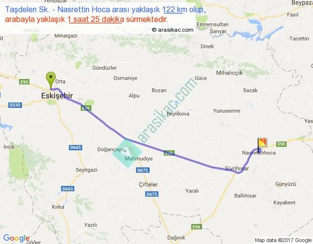 Taşdelen Sk. - Nasrettin Hoca arası yaklaşık olarak 90 km/h ile yukarıda belirtilen sürede olup, iki yerin kuş uçuşu uzaklığı (mesafesi) 104'dir. Yolculuk otobüsle 1 saat 50 dakika sürmektedir.