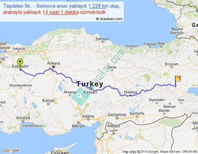 Taşdelen Sk. - Serinova arası yaklaşık olarak 90 km/h ile yukarıda belirtilen sürede olup, iki yerin kuş uçuşu uzaklığı (mesafesi) 948'dir. Eğer belirtilen yerler arasında uçak seferi var ise bu süre uçakla 1 saat 27 dakika'ya kadar düşebilir. Yolculuk otobüsle 18 saat 13 dakika sürmektedir.