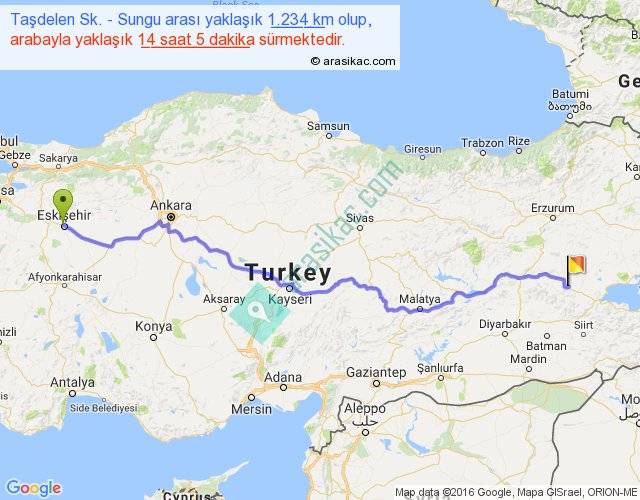 Taşdelen Sk. - Sungu arası yaklaşık olarak 90 km/h ile yukarıda belirtilen sürede olup, iki yerin kuş uçuşu uzaklığı (mesafesi) 958'dir. Eğer belirtilen yerler arasında uçak seferi var ise bu süre uçakla 1 saat 28 dakika'ya kadar düşebilir. Yolculuk otobüsle 18 saat 18 dakika sürmektedir.