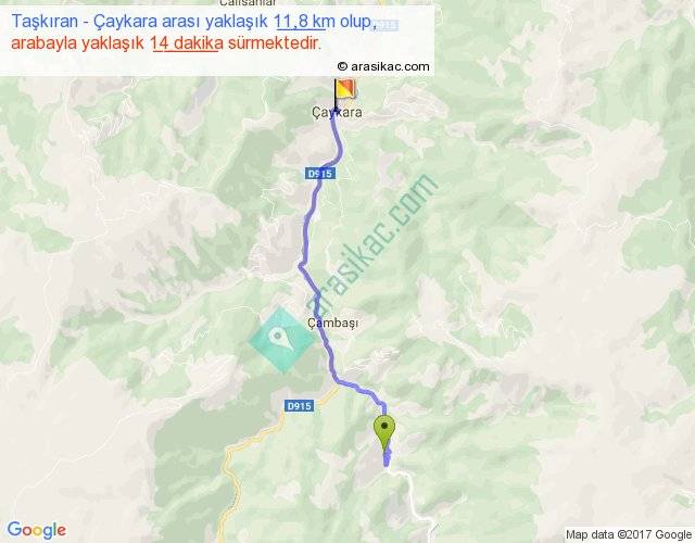 Taşkıran - Çaykara arası yaklaşık olarak 90 km/h ile yukarıda belirtilen sürede olup, iki yerin kuş uçuşu uzaklığı (mesafesi) 9'dir. Yolculuk otobüsle 18 dakika sürmektedir.
