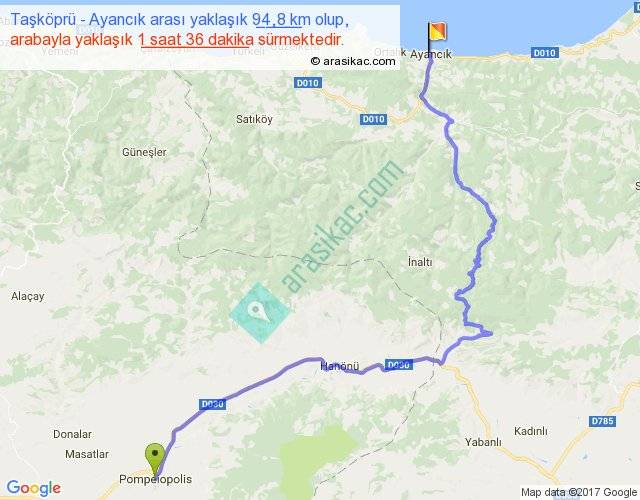 Taşköprü - Ayancık arası yaklaşık olarak 90 km/h ile yukarıda belirtilen sürede olup, iki yerin kuş uçuşu uzaklığı (mesafesi) 57'dir. Yolculuk otobüsle 2 saat 4 dakika sürmektedir.