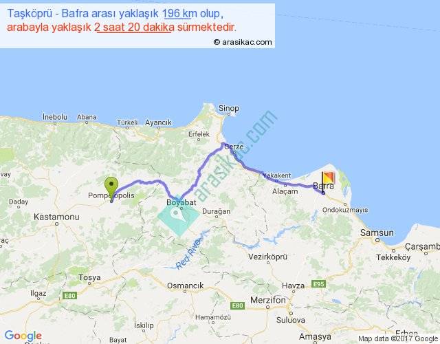 Taşköprü - Bafra arası yaklaşık olarak 90 km/h ile yukarıda belirtilen sürede olup, iki yerin kuş uçuşu uzaklığı (mesafesi) 140'dir. Yolculuk otobüsle 3 saat 2 dakika sürmektedir.