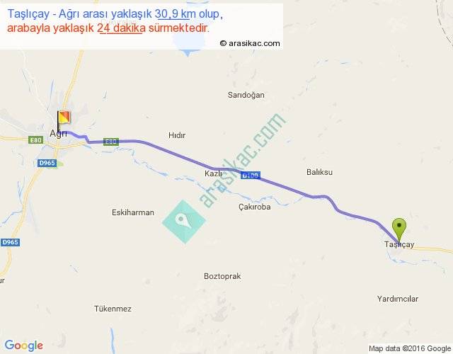 Taşlıçay - Ağrı arası yaklaşık olarak 90 km/h ile yukarıda belirtilen sürede olup, iki yerin kuş uçuşu uzaklığı (mesafesi) 30'dir. Yolculuk otobüsle 31 dakika sürmektedir.