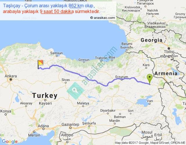 Taşlıçay - Çorum arası yaklaşık olarak 90 km/h ile yukarıda belirtilen sürede olup, iki yerin kuş uçuşu uzaklığı (mesafesi) 720'dir. Eğer belirtilen yerler arasında uçak seferi var ise bu süre uçakla 1 saat 06 dakika'ya kadar düşebilir. Yolculuk otobüsle 12 saat 47 dakika sürmektedir.