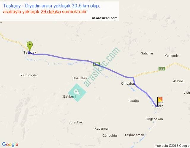 Taşlıçay - Diyadin arası yaklaşık olarak 90 km/h ile yukarıda belirtilen sürede olup, iki yerin kuş uçuşu uzaklığı (mesafesi) 27'dir. Yolculuk otobüsle 37 dakika sürmektedir.