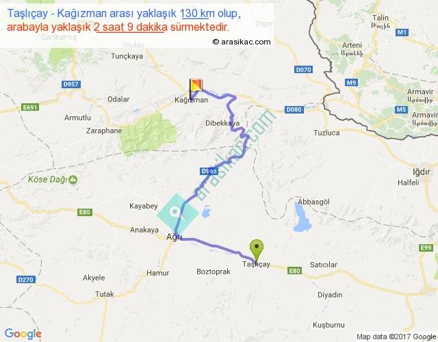 Taşlıçay - Kağızman arası yaklaşık olarak 90 km/h ile yukarıda belirtilen sürede olup, iki yerin kuş uçuşu uzaklığı (mesafesi) 60'dir. Yolculuk otobüsle 2 saat 47 dakika sürmektedir.