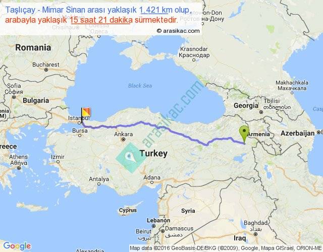Taşlıçay - Mimar Sinan arası yaklaşık olarak 90 km/h ile yukarıda belirtilen sürede olup, iki yerin kuş uçuşu uzaklığı (mesafesi) 1198'dir. Eğer belirtilen yerler arasında uçak seferi var ise bu süre uçakla 1 saat 50 dakika'ya kadar düşebilir. Yolculuk otobüsle 19 saat 57 dakika sürmektedir.