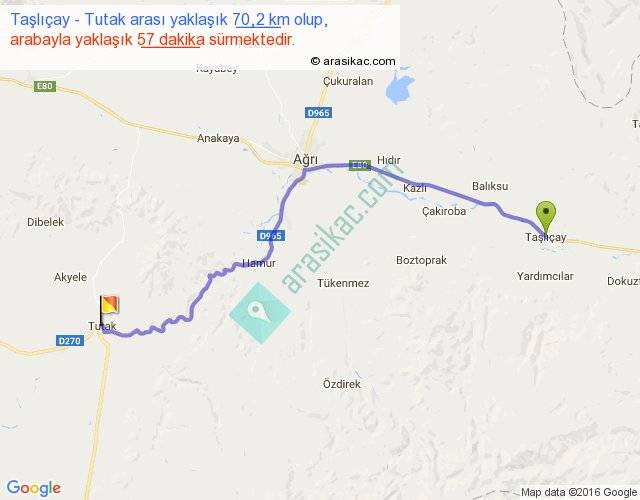 Taşlıçay - Tutak arası yaklaşık olarak 90 km/h ile yukarıda belirtilen sürede olup, iki yerin kuş uçuşu uzaklığı (mesafesi) 53'dir. Yolculuk otobüsle 1 saat 14 dakika sürmektedir.