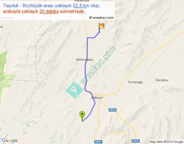 Taşoluk - Bozhüyük arası yaklaşık olarak 90 km/h ile yukarıda belirtilen sürede olup, iki yerin kuş uçuşu uzaklığı (mesafesi) 19'dir. Yolculuk otobüsle 26 dakika sürmektedir.