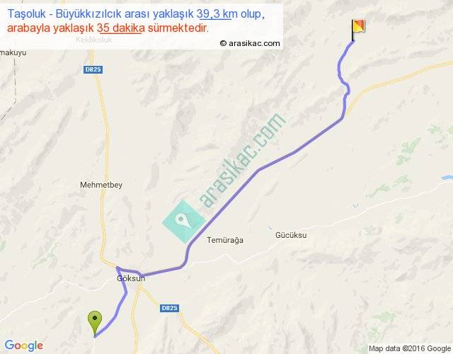Taşoluk - Büyükkızılcık arası yaklaşık olarak 90 km/h ile yukarıda belirtilen sürede olup, iki yerin kuş uçuşu uzaklığı (mesafesi) 33'dir. Yolculuk otobüsle 45 dakika sürmektedir.