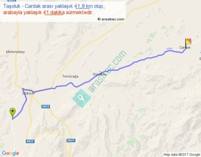 Taşoluk - Cardak arası yaklaşık olarak 90 km/h ile yukarıda belirtilen sürede olup, iki yerin kuş uçuşu uzaklığı (mesafesi) 36'dir. Yolculuk otobüsle 53 dakika sürmektedir.