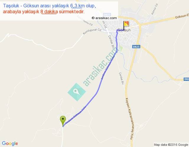 Taşoluk - Göksun arası yaklaşık olarak 90 km/h ile yukarıda belirtilen sürede olup, iki yerin kuş uçuşu uzaklığı (mesafesi) 6'dir. Yolculuk otobüsle 10 dakika sürmektedir.