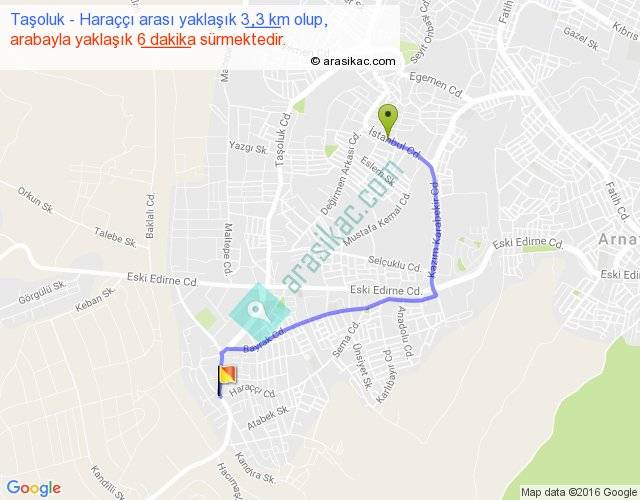 Taşoluk - Haraççı arası yaklaşık olarak 90 km/h ile yukarıda belirtilen sürede olup, iki yerin kuş uçuşu uzaklığı (mesafesi) 2'dir. Yolculuk otobüsle 7 dakika sürmektedir.