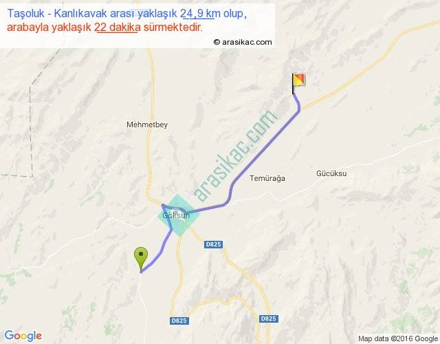Taşoluk - Kanlıkavak arası yaklaşık olarak 90 km/h ile yukarıda belirtilen sürede olup, iki yerin kuş uçuşu uzaklığı (mesafesi) 20'dir. Yolculuk otobüsle 28 dakika sürmektedir.