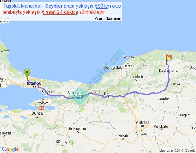 Taşoluk Mahallesi - Seydiler arası yaklaşık olarak 90 km/h ile yukarıda belirtilen sürede olup, iki yerin kuş uçuşu uzaklığı (mesafesi) 417'dir. Eğer belirtilen yerler arasında uçak seferi var ise bu süre uçakla 38 dakika'ya kadar düşebilir. Yolculuk otobüsle 8 saat 19 dakika sürmektedir.