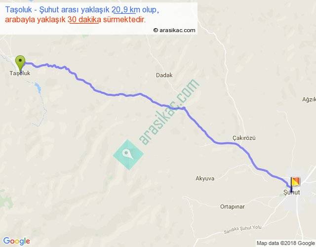 Taşoluk - Şuhut arası yaklaşık olarak 90 km/h ile yukarıda belirtilen sürede olup, iki yerin kuş uçuşu uzaklığı (mesafesi) 18'dir. Yolculuk otobüsle 39 dakika sürmektedir.
