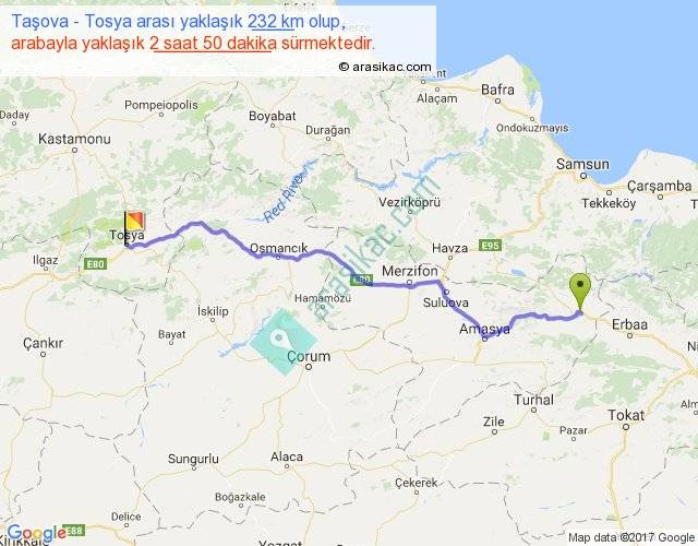 Taşova - Tosya arası yaklaşık olarak 90 km/h ile yukarıda belirtilen sürede olup, iki yerin kuş uçuşu uzaklığı (mesafesi) 193'dir. Yolculuk otobüsle 3 saat 41 dakika sürmektedir.