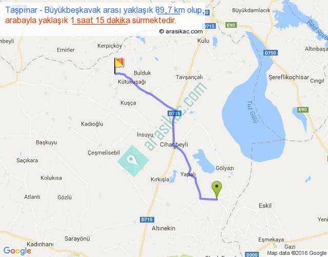 Taşpınar - Büyükbeşkavak arası yaklaşık olarak 90 km/h ile yukarıda belirtilen sürede olup, iki yerin kuş uçuşu uzaklığı (mesafesi) 75'dir. Yolculuk otobüsle 1 saat 37 dakika sürmektedir.