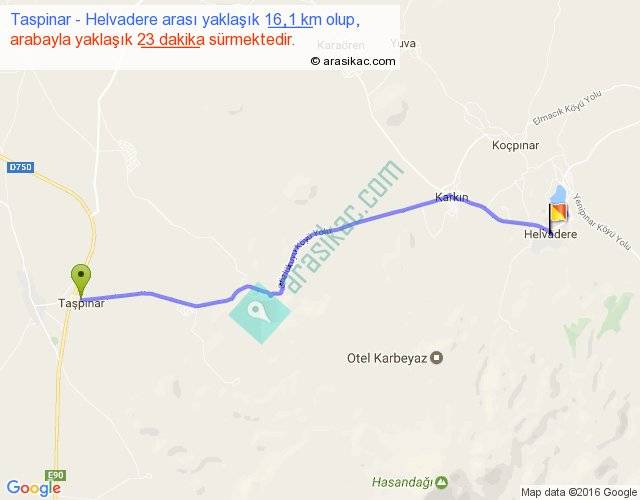Taspinar - Helvadere arası yaklaşık olarak 90 km/h ile yukarıda belirtilen sürede olup, iki yerin kuş uçuşu uzaklığı (mesafesi) 14'dir. Yolculuk otobüsle 29 dakika sürmektedir.