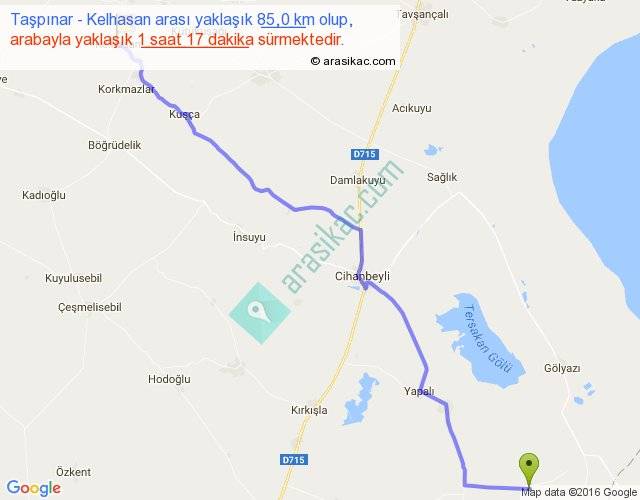 Taşpınar - Kelhasan arası yaklaşık olarak 90 km/h ile yukarıda belirtilen sürede olup, iki yerin kuş uçuşu uzaklığı (mesafesi) 72'dir. Yolculuk otobüsle 1 saat 40 dakika sürmektedir.