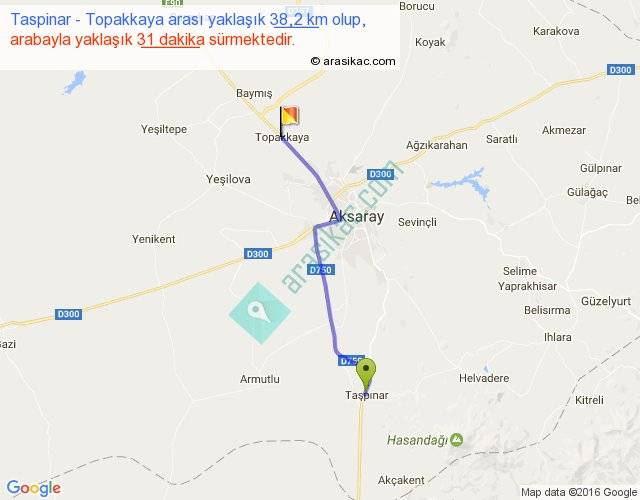 Taspinar - Topakkaya arası yaklaşık olarak 90 km/h ile yukarıda belirtilen sürede olup, iki yerin kuş uçuşu uzaklığı (mesafesi) 32'dir. Yolculuk otobüsle 40 dakika sürmektedir.