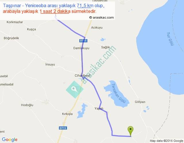 Taşpınar - Yeniceoba arası yaklaşık olarak 90 km/h ile yukarıda belirtilen sürede olup, iki yerin kuş uçuşu uzaklığı (mesafesi) 59'dir. Yolculuk otobüsle 1 saat 20 dakika sürmektedir.