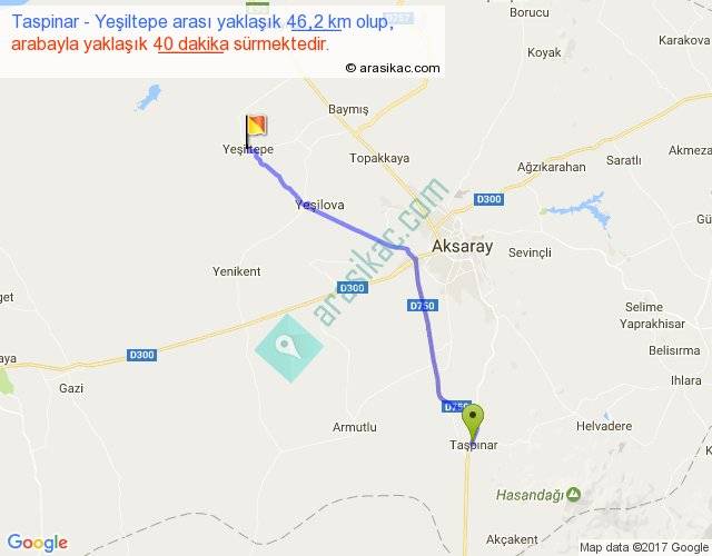 Taspinar - Yeşiltepe arası yaklaşık olarak 90 km/h ile yukarıda belirtilen sürede olup, iki yerin kuş uçuşu uzaklığı (mesafesi) 40'dir. Yolculuk otobüsle 52 dakika sürmektedir.
