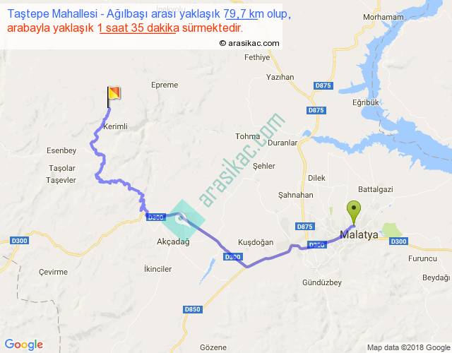 Taştepe Mahallesi - Ağılbaşı arası yaklaşık olarak 90 km/h ile yukarıda belirtilen sürede olup, iki yerin kuş uçuşu uzaklığı (mesafesi) 46'dir. Yolculuk otobüsle 2 saat 3 dakika sürmektedir.