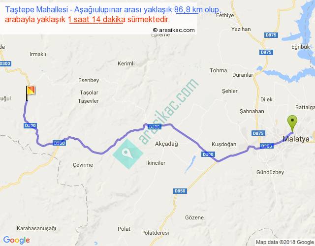 Taştepe Mahallesi - Aşağıulupınar arası yaklaşık olarak 90 km/h ile yukarıda belirtilen sürede olup, iki yerin kuş uçuşu uzaklığı (mesafesi) 65'dir. Yolculuk otobüsle 1 saat 36 dakika sürmektedir.