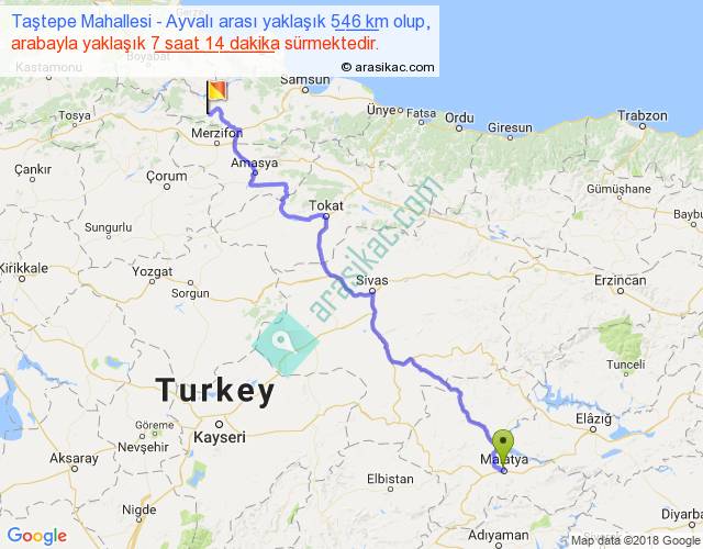 Taştepe Mahallesi - Ayvalı arası yaklaşık olarak 90 km/h ile yukarıda belirtilen sürede olup, iki yerin kuş uçuşu uzaklığı (mesafesi) 392'dir. Eğer belirtilen yerler arasında uçak seferi var ise bu süre uçakla 36 dakika'ya kadar düşebilir. Yolculuk otobüsle 9 saat 24 dakika sürmektedir.