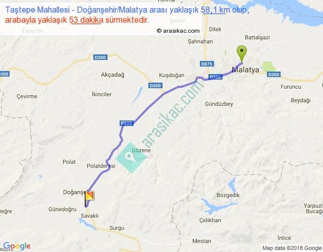 Taştepe Mahallesi - Doğanşehir Malatya arası yaklaşık olarak 90 km/h ile yukarıda belirtilen sürede olup, iki yerin kuş uçuşu uzaklığı (mesafesi) 50'dir. Yolculuk otobüsle 1 saat 8 dakika sürmektedir.