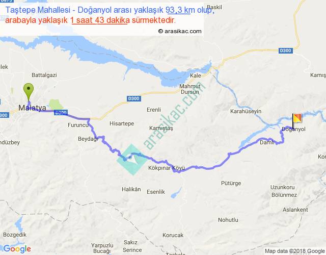 Taştepe Mahallesi - Doğanyol arası yaklaşık olarak 90 km/h ile yukarıda belirtilen sürede olup, iki yerin kuş uçuşu uzaklığı (mesafesi) 62'dir. Yolculuk otobüsle 2 saat 13 dakika sürmektedir.