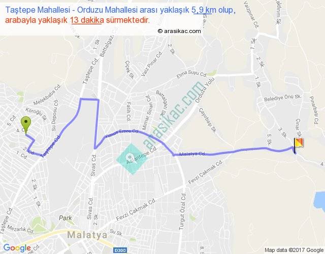 Taştepe Mahallesi - Orduzu Mahallesi arası yaklaşık olarak 90 km/h ile yukarıda belirtilen sürede olup, iki yerin kuş uçuşu uzaklığı (mesafesi) 4'dir. Yolculuk otobüsle 16 dakika sürmektedir.