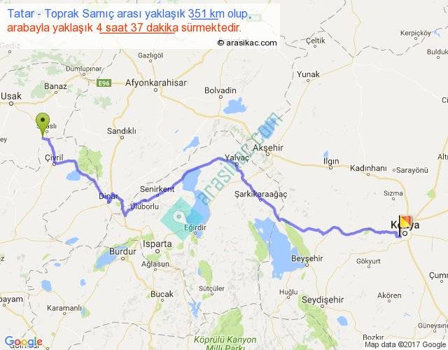 Tatar - Toprak Sarnıç arası yaklaşık olarak 90 km/h ile yukarıda belirtilen sürede olup, iki yerin kuş uçuşu uzaklığı (mesafesi) 253'dir. Eğer belirtilen yerler arasında uçak seferi var ise bu süre uçakla 23 dakika'ya kadar düşebilir. Yolculuk otobüsle 6 saat 0 dakika sürmektedir.