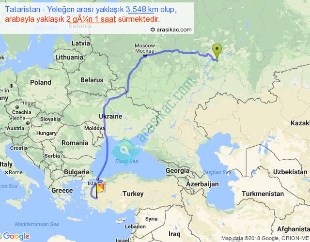 Tataristan - Yeleğen arası yaklaşık olarak 90 km/h ile yukarıda belirtilen sürede olup, iki yerin kuş uçuşu uzaklığı (mesafesi) 2470'dir. Eğer belirtilen yerler arasında uçak seferi var ise bu süre uçakla 3 saat 48 dakika'ya kadar düşebilir. Yolculuk otobüsle 2 gün 15 saat sürmektedir.