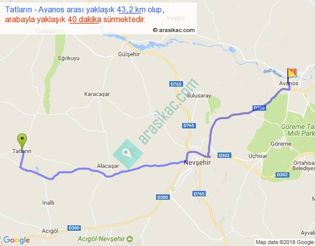 Tatların - Avanos arası yaklaşık olarak 90 km/h ile yukarıda belirtilen sürede olup, iki yerin kuş uçuşu uzaklığı (mesafesi) 33'dir. Yolculuk otobüsle 52 dakika sürmektedir.