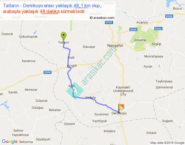 Tatların - Derinkuyu arası yaklaşık olarak 90 km/h ile yukarıda belirtilen sürede olup, iki yerin kuş uçuşu uzaklığı (mesafesi) 37'dir. Yolculuk otobüsle 1 saat 2 dakika sürmektedir.