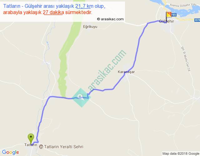 Tatların - Gülşehir arası yaklaşık olarak 90 km/h ile yukarıda belirtilen sürede olup, iki yerin kuş uçuşu uzaklığı (mesafesi) 17'dir. Yolculuk otobüsle 35 dakika sürmektedir.