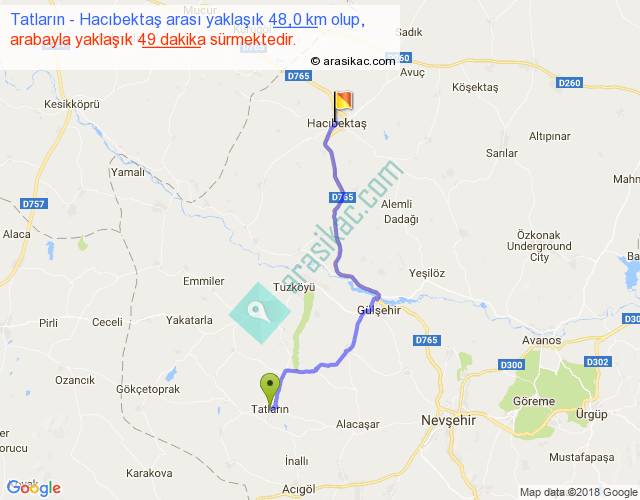 Tatların - Hacıbektaş arası yaklaşık olarak 90 km/h ile yukarıda belirtilen sürede olup, iki yerin kuş uçuşu uzaklığı (mesafesi) 35'dir. Yolculuk otobüsle 1 saat 3 dakika sürmektedir.
