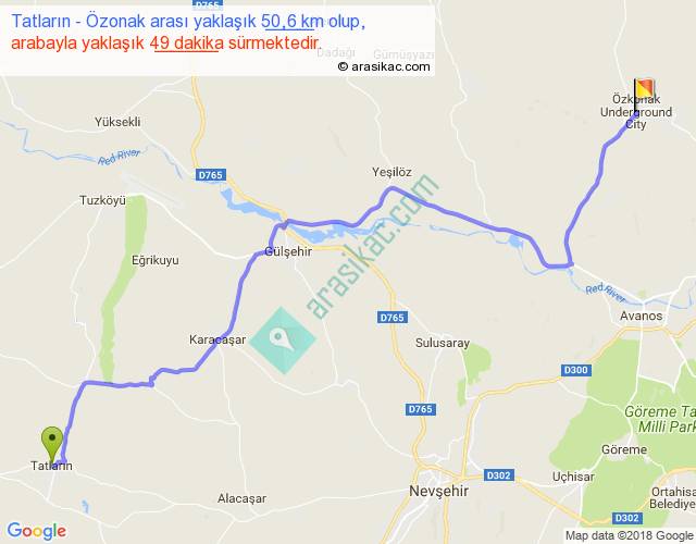 Tatların - Özonak arası yaklaşık olarak 90 km/h ile yukarıda belirtilen sürede olup, iki yerin kuş uçuşu uzaklığı (mesafesi) 37'dir. Yolculuk otobüsle 1 saat 3 dakika sürmektedir.