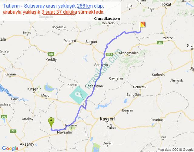 Tatların - Sulusaray arası yaklaşık olarak 90 km/h ile yukarıda belirtilen sürede olup, iki yerin kuş uçuşu uzaklığı (mesafesi) 204'dir. Yolculuk otobüsle 4 saat 42 dakika sürmektedir.