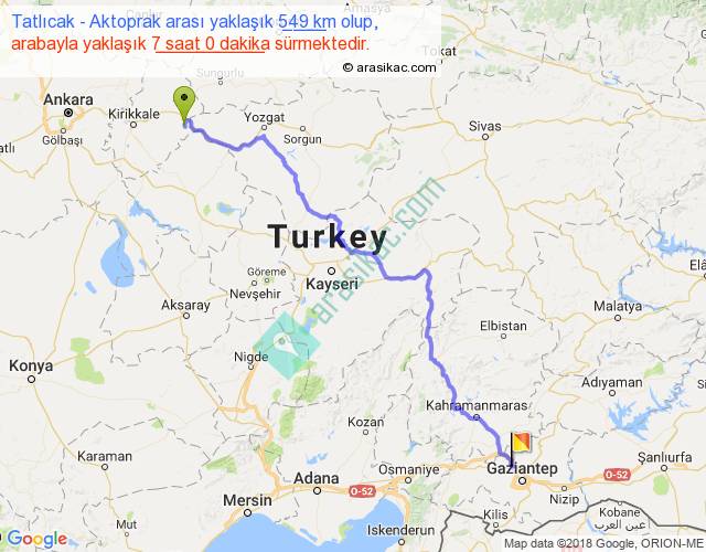 Tatlıcak - Aktoprak arası yaklaşık olarak 90 km/h ile yukarıda belirtilen sürede olup, iki yerin kuş uçuşu uzaklığı (mesafesi) 407'dir. Eğer belirtilen yerler arasında uçak seferi var ise bu süre uçakla 37 dakika'ya kadar düşebilir. Yolculuk otobüsle 9 saat 6 dakika sürmektedir.