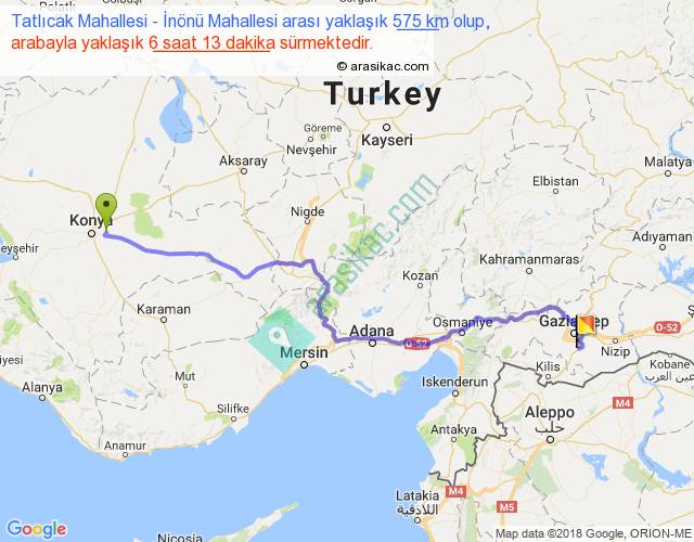 Tatlıcak Mahallesi - İnönü Mahallesi arası yaklaşık olarak 90 km/h ile yukarıda belirtilen sürede olup, iki yerin kuş uçuşu uzaklığı (mesafesi) 433'dir. Eğer belirtilen yerler arasında uçak seferi var ise bu süre uçakla 39 dakika'ya kadar düşebilir. Yolculuk otobüsle 8 saat 4 dakika sürmektedir.