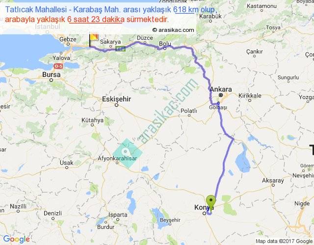 Tatlıcak Mahallesi - Karabaş Mah. arası yaklaşık olarak 90 km/h ile yukarıda belirtilen sürede olup, iki yerin kuş uçuşu uzaklığı (mesafesi) 394'dir. Eğer belirtilen yerler arasında uçak seferi var ise bu süre uçakla 36 dakika'ya kadar düşebilir. Yolculuk otobüsle 8 saat 17 dakika sürmektedir.