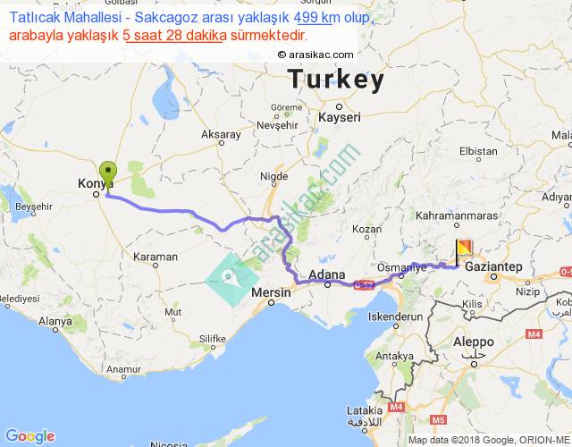 Tatlıcak Mahallesi - Sakcagoz arası yaklaşık olarak 90 km/h ile yukarıda belirtilen sürede olup, iki yerin kuş uçuşu uzaklığı (mesafesi) 385'dir. Eğer belirtilen yerler arasında uçak seferi var ise bu süre uçakla 35 dakika'ya kadar düşebilir. Yolculuk otobüsle 7 saat 6 dakika sürmektedir.